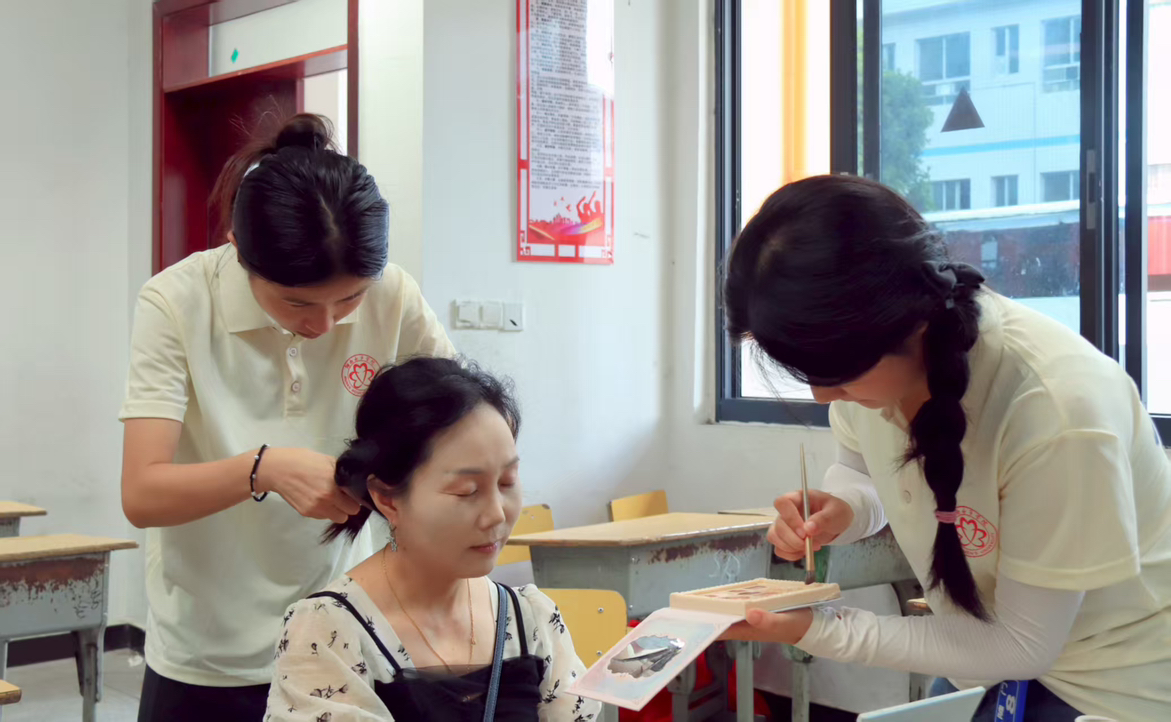 本网讯(校团委 陈湘 谢亚妤 骆嘉雯) 七月的午后暑气蒸腾,洪江市熟坪乡中心小学的礼堂里却格外清爽。7月13日,我校母亲赋能团队成员们正给妈妈们编着造型——这是我校母亲赋能实践团为 38位妈妈上的最后一堂化妆课。从基础护肤到简易妆容,志愿者手把手教妈妈们。课程结束后,一场充满温情的结课仪式为在熟坪乡为期一周的母亲赋能课程画上圆满句号。