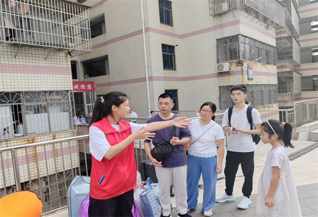 学院领导与新生辅导员提前走访新生宿舍,组织助理辅导员、学生党员及团学干部开展多轮卫生清扫与设施检查,确保每间宿舍干净整洁、设施完备。迎新期间,志愿者们分批轮岗,分别驻守校门、报到点和宿舍区,构建“点对点”服务链条。学院继续推行“一带四”精准对接机制,每名志愿者负责四位新生,提供全程陪伴与引导,确保新生顺利入学、安心入住。