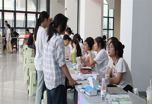 迎新现场,学院领导一线指挥,辅导员、学生党员和助理辅导员全程在岗,及时回应新生与家长的各类疑问。志愿者们统一着装、精神饱满,积极协助搬运行李、介绍校园环境、解答入学事宜,展现出高度的责任感和服务意识。为彰显文化育人特色,学院特别设置了传统文化体验区,由新生及家长亲手体验制作漆扇,擅长书法的学生现场挥毫,为新生题写女书祝福,这一独特环节吸引了大量新生家庭驻足体验。学院还特别设置家长休息区,提供饮水与咨询服务,用真诚的微笑和细致的关怀,传递“商院温度”。