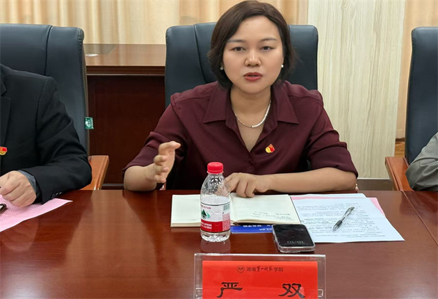 本网讯(商学院 廖彪)9月25日下午,我校商学院党委书记严双率党委班子成员、师生党支部书记一行10人赴湖南第一师范学院商学院开展党建专题交流活动。交流会议在一师东方红校区玉衡楼南栋404会议室举行,由一师商学院党委书记邓剑主持。