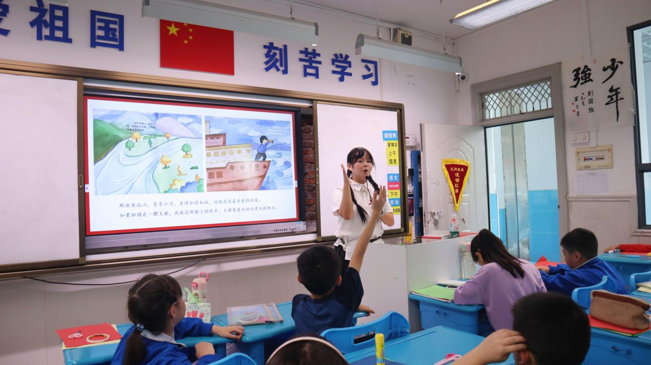 “我和我的祖国,一刻也不能分割……”轻柔的童声从教室中传出,志愿者陈慧手持《我和我的祖国》绘本,蹲在孩子们中间,指着书中长城插图问道:“大家知道这座‘长龙’已经守护我们多少年了吗?”孩子们睁大眼睛,七嘴八舌地猜着“五百年!”“一千年!”。当志愿者说出“两千多年”时,前排一个小女孩专注地凝视着图案,伸手轻轻抚摸书页上的砖墙,仿佛想感受那千年风雨的洗礼。