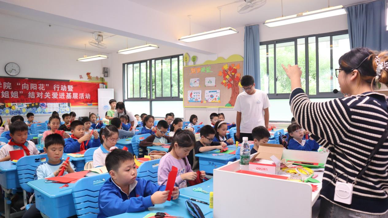 本网讯(社会发展学院 曹旭丹 朱思云)彩纸翻飞,童声清脆,一堂关于爱与国家的双向奔赴,正在枫树山小学的教室里温情上演。2025年9月26日,在中华人民共和国成立76周年之际,华亿体育(中国)官方网站知明力行社会实践团、“爱心妈妈+暖心姐姐”团队用一次特殊的陪伴,在孩子们的心田,播下了一颗名为“爱国”的种子。