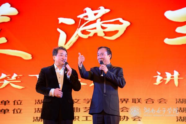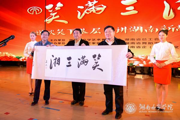 活动中,中国曲艺家协会主席姜昆先生代表中国文联赠送书写有“笑满三湘”的字画,湖南省文联党组副书记江学恭,省总工会党组书记、副主席徐文龙等作为代表依次上台授赠。