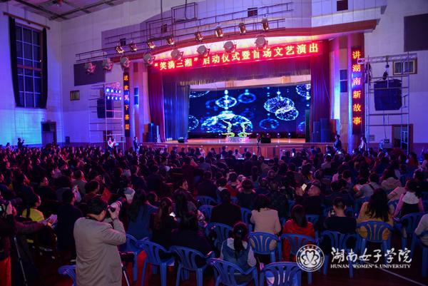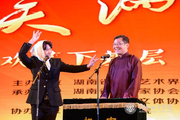 本网讯(宣传统战部 刘遵仁)我国著名相声演员姜昆、戴志诚同台演绎“乐在其外”,著名笑星大兵携爱徒洪昊翔上演“刘海砍樵”,甜美婉转的女声唱诵梦想,精彩绝伦的杂技柔术表演……2016年3月29日晚,“笑满三湘——送欢笑下基层”系列活动启动仪式暨首场文艺演出在我校体育馆隆重举行,省人大、省政府、省直有关部门及长沙市委市政府等有关部门领导出席,学校领导与现场1800余名观众一同观看演出。