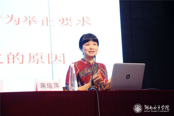 报告会开篇蒋璟萍提出:身为女子学院的一员,我们要秉承校训“懿德睿智,笃行臻美”和“自信、自尊、自立、自强”的四自精神,着力打造良好形象。她从国家形象与国民文明素养的关系着手,阐述了文明守礼的重要性,强调文明守礼不仅展示公民个人的素质与形象,更凸显着国家的素质与形象。