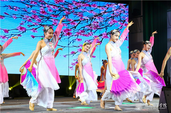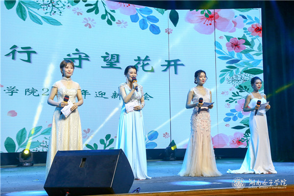 “四十年改革开放,风雨兼程,励精图治,看我泱泱中华展雄风;卅三载建校基业,艰难困苦,玉汝于成,听我湖南女院传佳音”,在四位主持人致开场词后,迎新晚会正式开始。