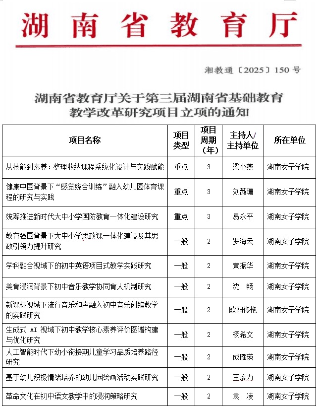 本网讯(教务处 邵尚)近日,湖南省教育厅发布了《关于第三届湖南省基础教育教学改革研究项目立项的通知》(湘教〔2025〕150号),我校共有11个项目获准立项,其中重点项目3项、一般项目8项,立项数量与质量均实现重大突破,在全省同类院校中位居前列,充分彰显了学校教育教学改革工作的显著成效。