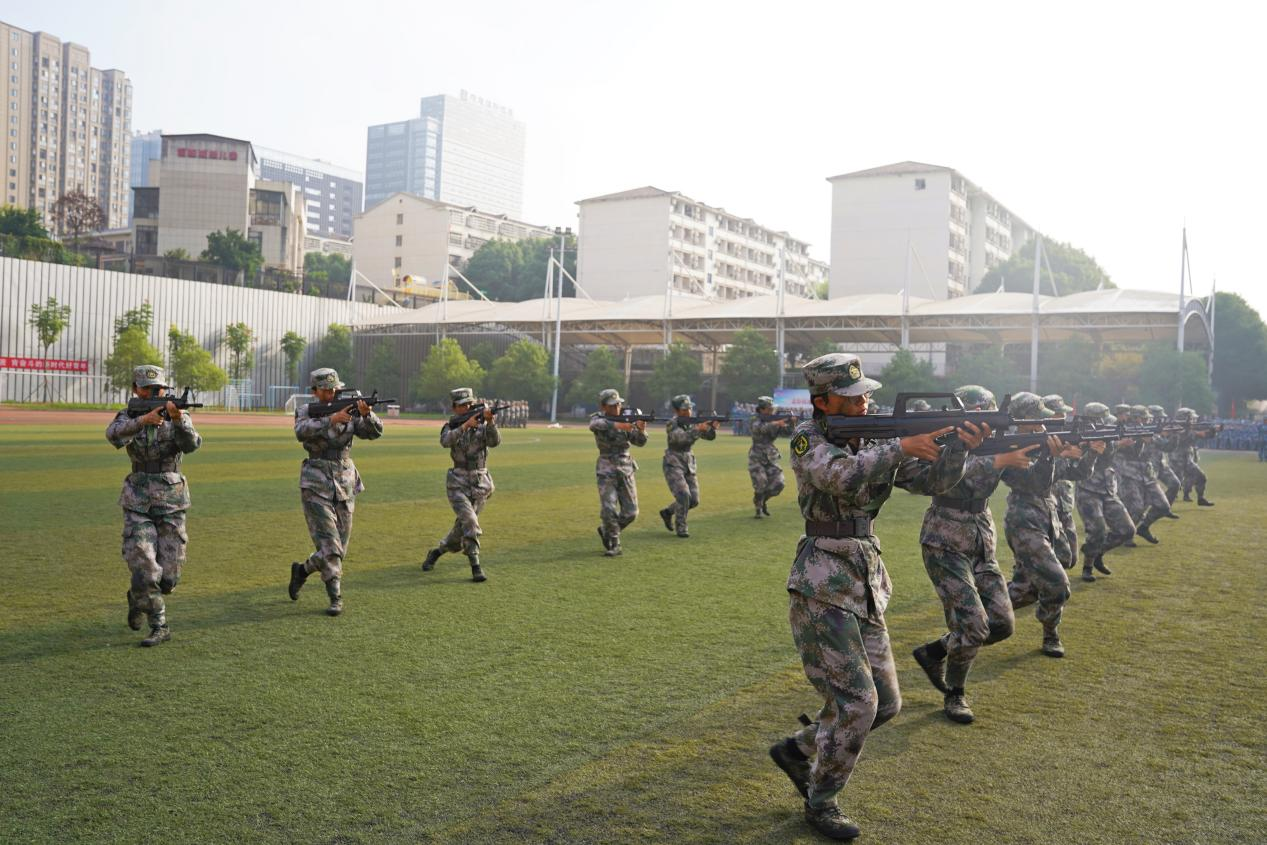 在军训总结表彰大会中,全体新生身着迷彩服,组成20个方队,雄赳赳、气昂昂地依次通过主席台接受检阅,武术刀、双截棍、格斗、倒功等汇报表演赢得了主席台热烈掌声。队列图案操中,800名新生用整齐有力的动作,依次变换出“80”“40”等字样和象征图案,展示了力与美的完美结合,抒发了对祖国、学校的美好祝愿。