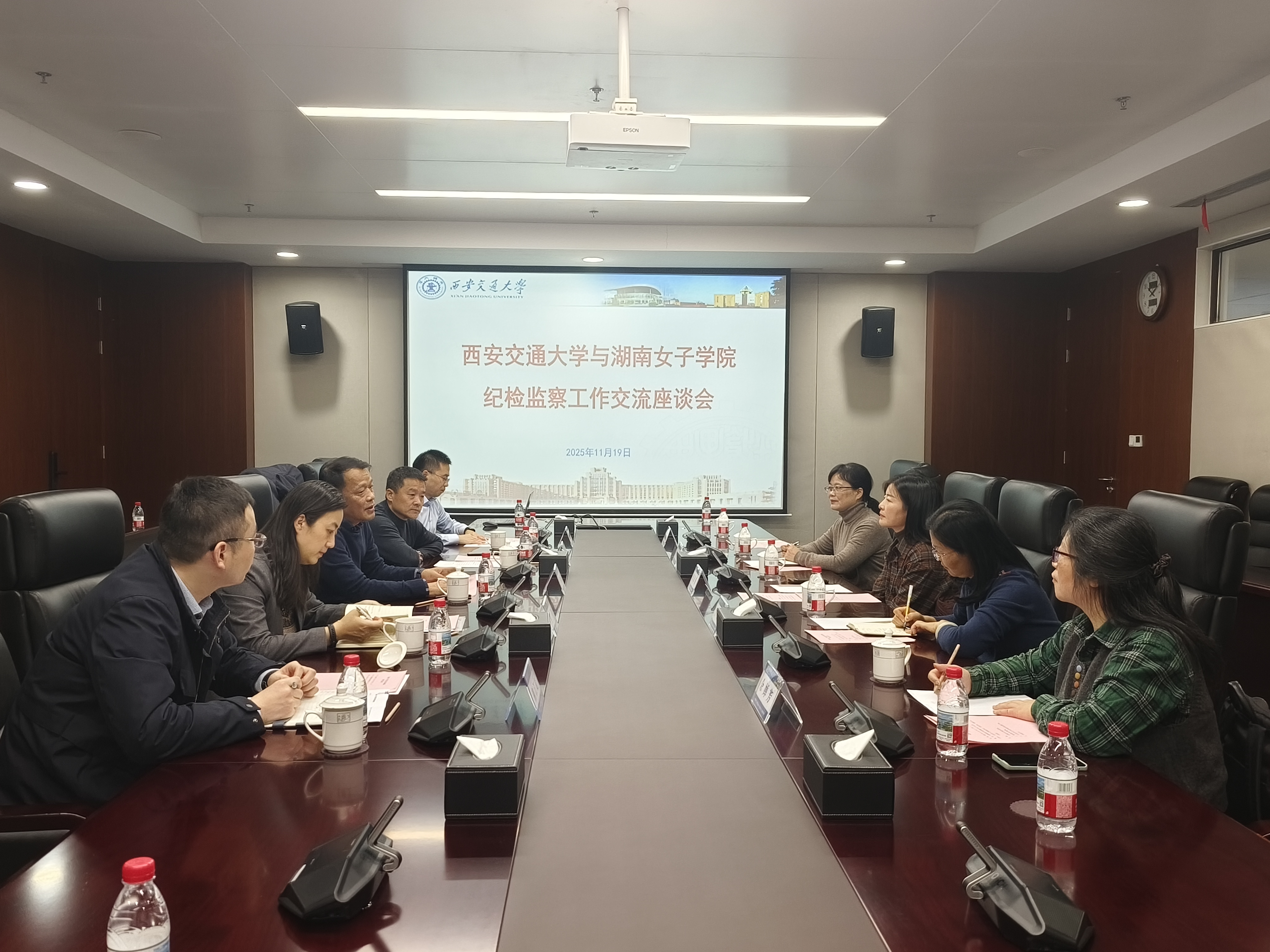 本网讯(纪委办 王胜乾)为学习借鉴高水平大学纪检监察工作的先进经验,进一步提升我校纪检监察工作规范化、法治化、正规化水平,推动“清廉女院”建设向纵深发展,11月19日上午,我校党委委员、纪委书记郭润葵率队赴西安交通大学开展学习交流。西安交通大学党委副书记、纪委书记、国家监委驻校监察专员马博虎热情接待郭润葵一行,并主持座谈交流。