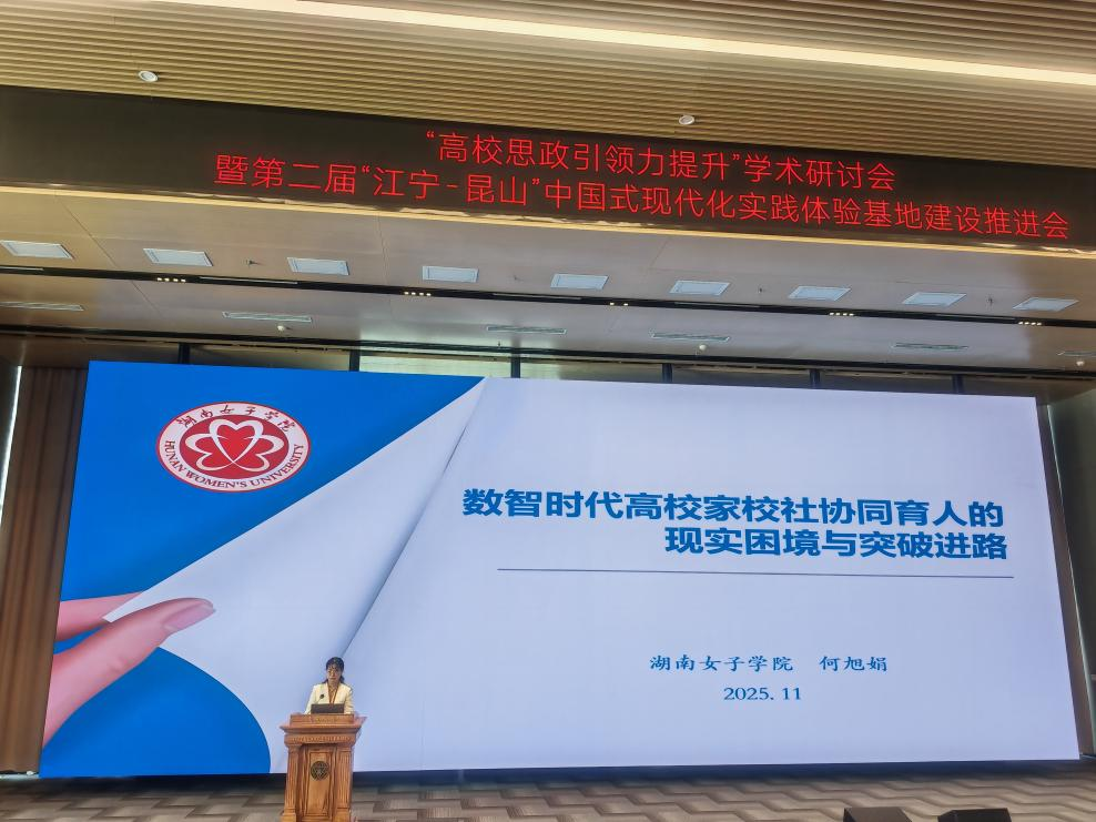 本网讯(学工部 欧彦宏)2025年11月22日上午,我校党委副书记、校长何旭娟率队参加在江苏省南京市举办的“思政引领力与数智时代思政新生态建构学术研讨会暨思想道德建设专业委员会2025年年会”,并作“数智时代高校家校社协同育人的困境与突破进路”主旨发言。