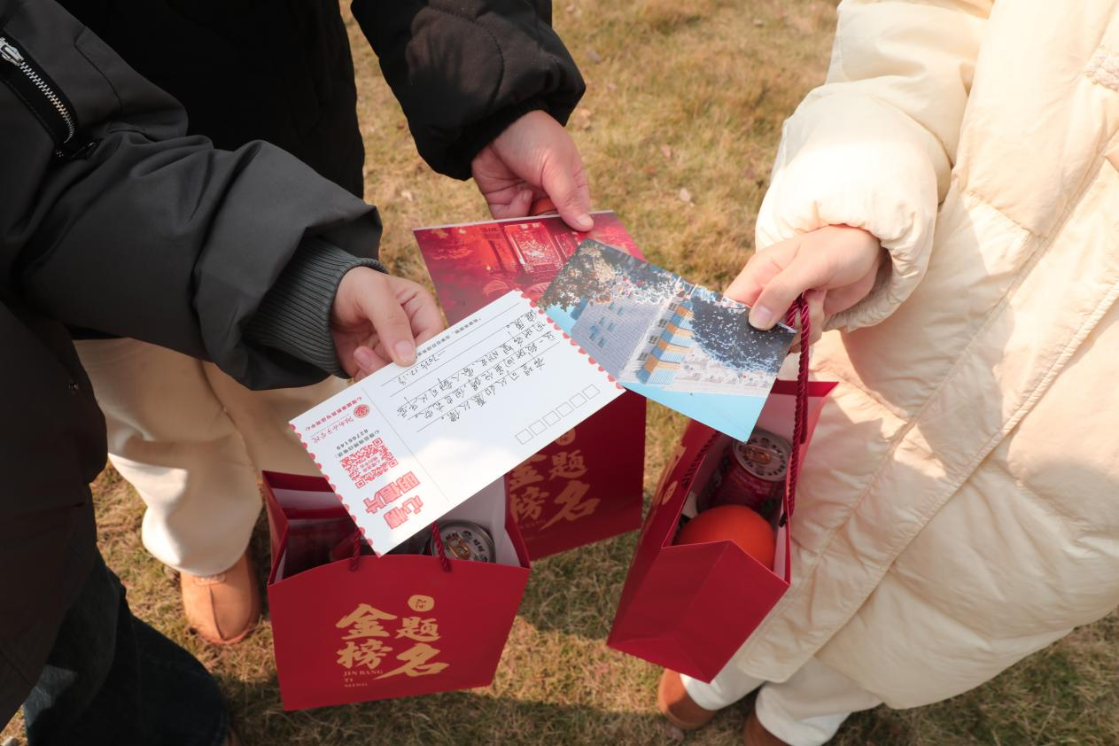 活动过程中,同学们在签名墙和祝福卡、明信片上写下自己的目标与姓名,或为正在备考的同学送上鼓励寄语。一句句真诚温暖的话语,承载着对未来的期许,也在无形中传递着同伴之间的支持与力量。完成寄语后,考研、考公、考编学生凭相关证明领取了学校精心准备的“上岸加油包”和女院专属帆布包。