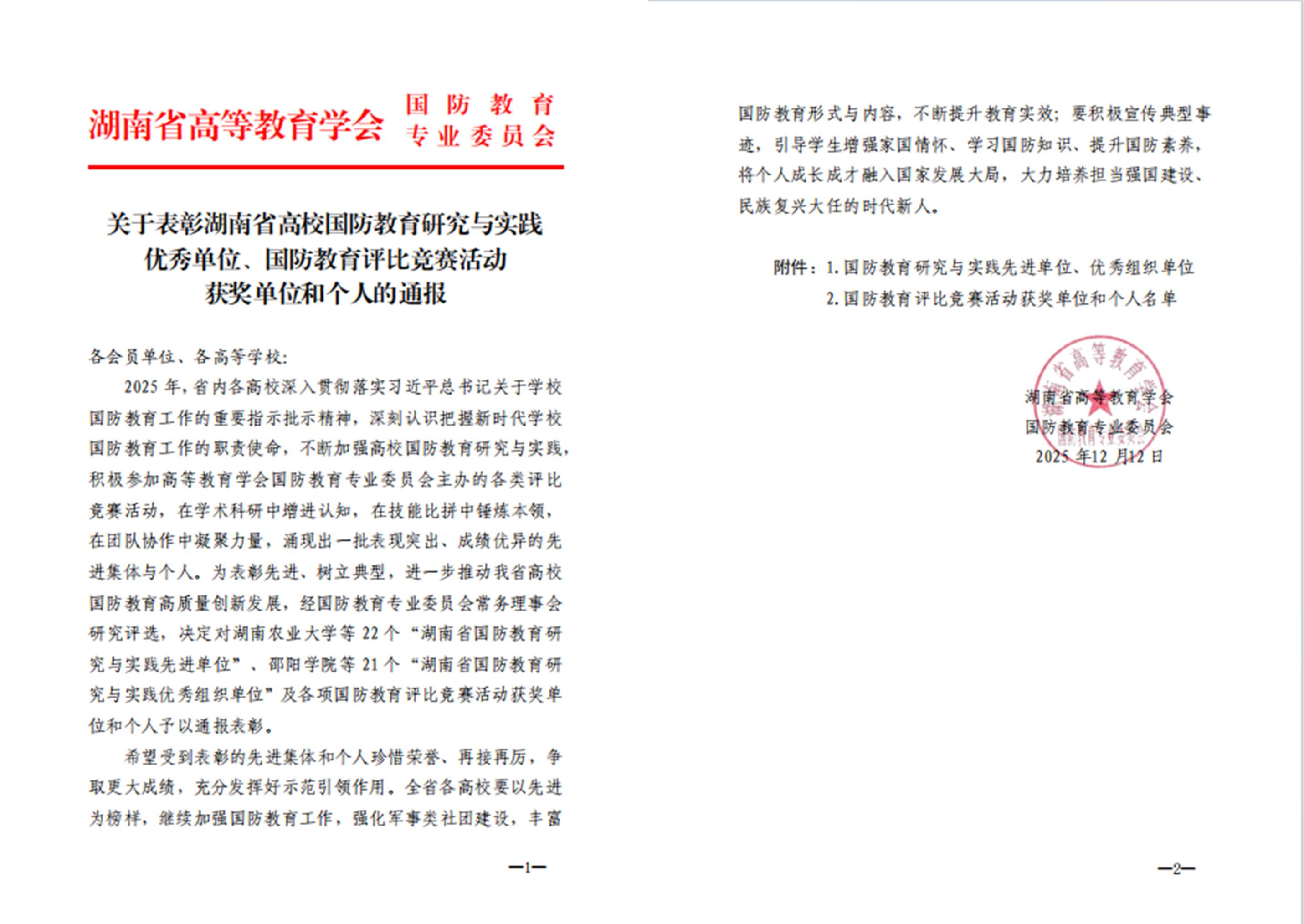 本网讯(学生工作部 陈翊 夏欣)近日,由湖南省教育厅指导的湖南省高等教育学会国防教育专业委员会2025年年会在岳阳职业技术学院圆满落幕。我校学生工作部(武装部)副部长张娟参会。会上传来喜讯:我校在系列评比中表现突出,获1项集体与2项个人省级荣誉,充分彰显了我校国防教育工作的扎实成效。
