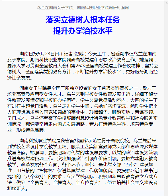 【湖南日报】乌兰:落实立德树人根本任务 提升办学治校水平