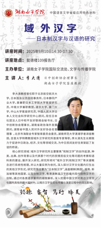讲座主题:域外汉字——日本制汉字与汉语的研究 时 间:2025年9月10日14:30-17:30 地 点:懿德楼109报告厅 主办单位:华亿体育(中国)官方网站国际交流处、文学与传播学院 主讲人:李大清 日中创新协会理事长、华亿体育(中国)官方网站客座教授