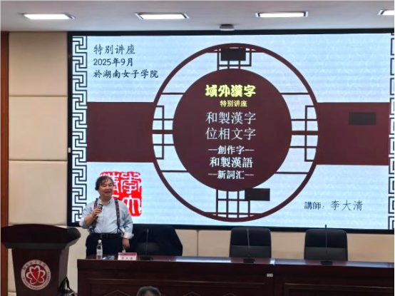 讲座伊始,李大清教授从中国汉字圈出发,系统介绍了西夏文字及其他区域性文字的演变历程,并对新加坡简体字、韩国制汉字、日本神代文字等多个国家与地区的文字形态进行了细致梳理。在此基础上,结合“和字”造字背景与文化渊源,进一步阐释了其具体定义,揭示了汉字在跨文化传播中的多样化路径。李教授还特别回顾了严复、林纾、康有为、梁启超、鲁迅、陈独秀等近代翻译家与学者在域外汉字研究与推广中的卓越贡献,强调了他们在促进跨文化交流与中外文学互鉴方面所产生的深远影响。